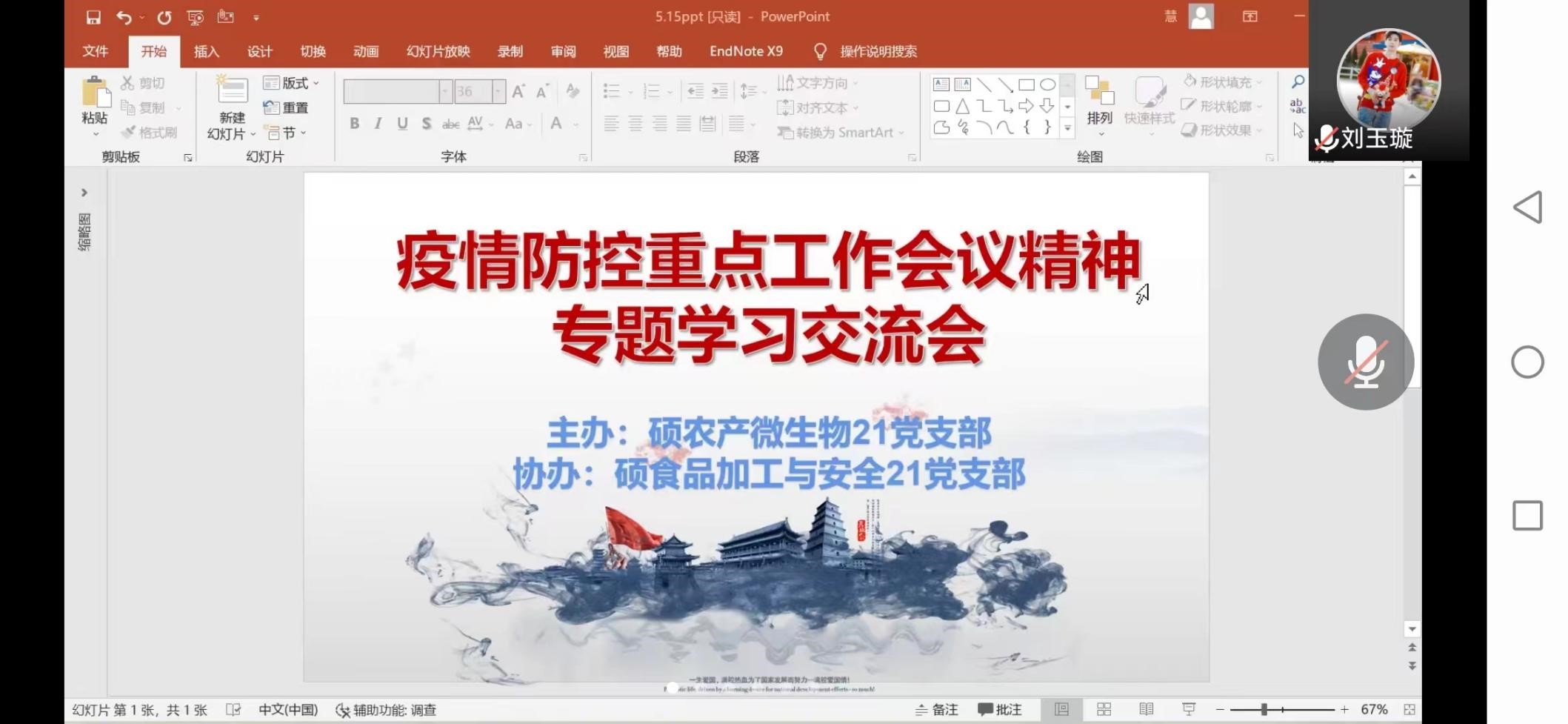 硕食品加工与安全21党支部党员领学了5月5日习总书记发表抓紧抓实疫情防控重点工作精神。为响应习总书记疫情防控重点工作的精神,全面认识党中央确定的疫情防控方针政策,她号召两支部党员带头落实疫情防控工作责任,模范遵守疫情防控各项要求规定,自觉做好本人健康监测,坚决落实学校各项疫情防控政策。