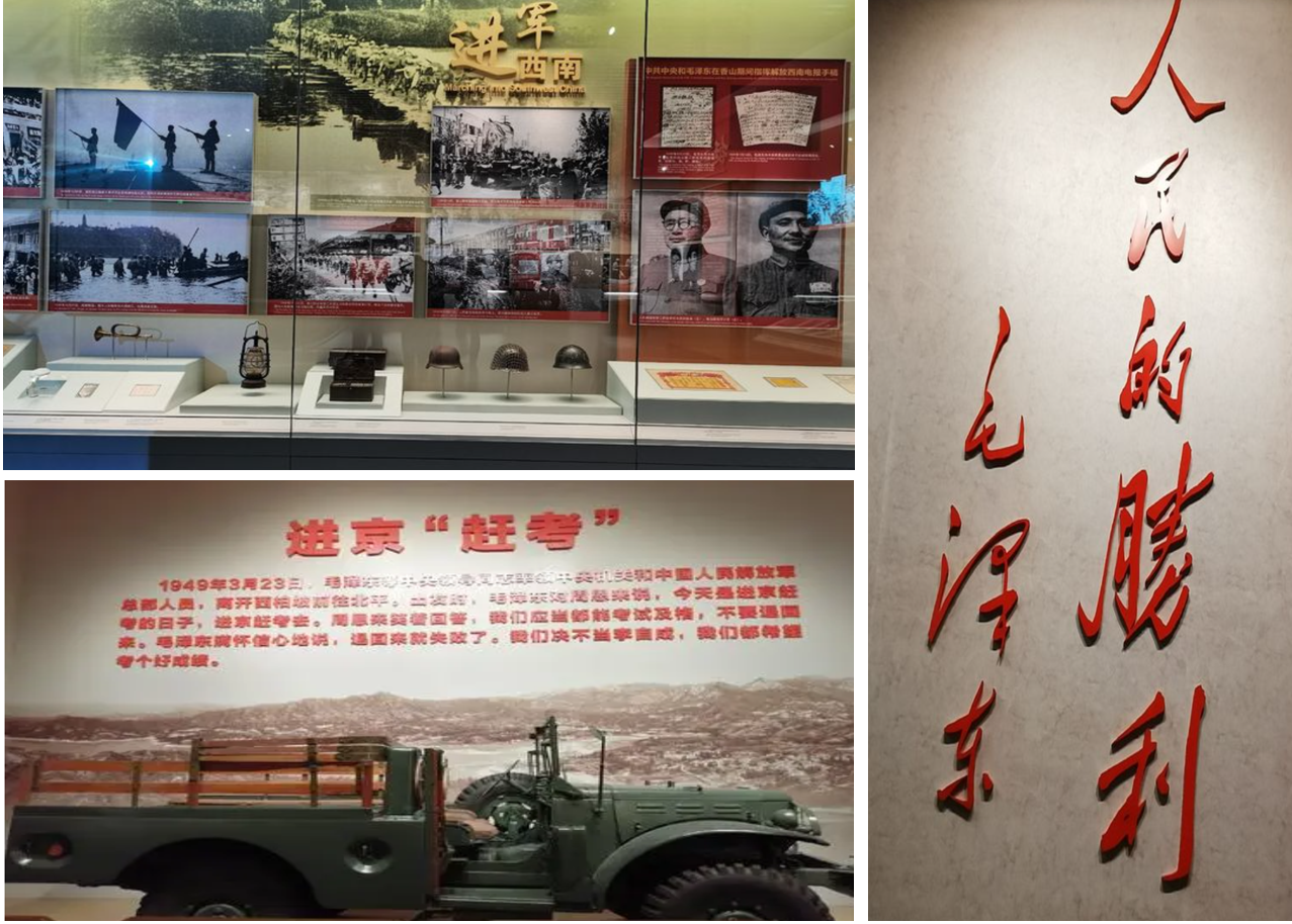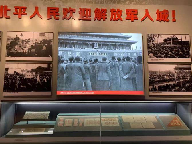 展览以历史照片、老报纸、战争地图等实物陈列生动展现了革命先辈们艰苦斗争以夺取革命胜利的光辉历史;用新媒体艺术动态影像高度再现了当年“西苑机场阅兵仪式”和“开国大典”的历史全过程。展馆陈列革命历史文物还包括真实笔记手稿、革命先烈佩戴过的党徽、“进京赶考”时毛主席乘坐的吉普车、“开国大典”时挂在天安门广场前的大灯笼等。