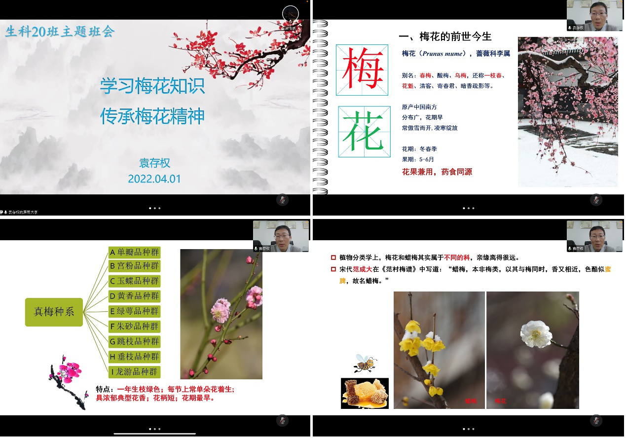 春暖花开,梅香正浓。4月2日下午5:30,生科20班“学习梅花知识,传承梅花精神”系列主题教育活动在企业微信线上平台正式拉开序幕。班主任国家花卉工程技术研究中心袁存权老师首先为同学们精心准备了关于梅花的科普讲座,随后,以梅花为主题的“梅花成语接龙”、“梅花经典诗词鉴赏”、“我眼中的梅花——摄影、书法、绘画”、“青年讲梅花精神故事”等系列主题活动在生科20班全体成员中陆续开展。