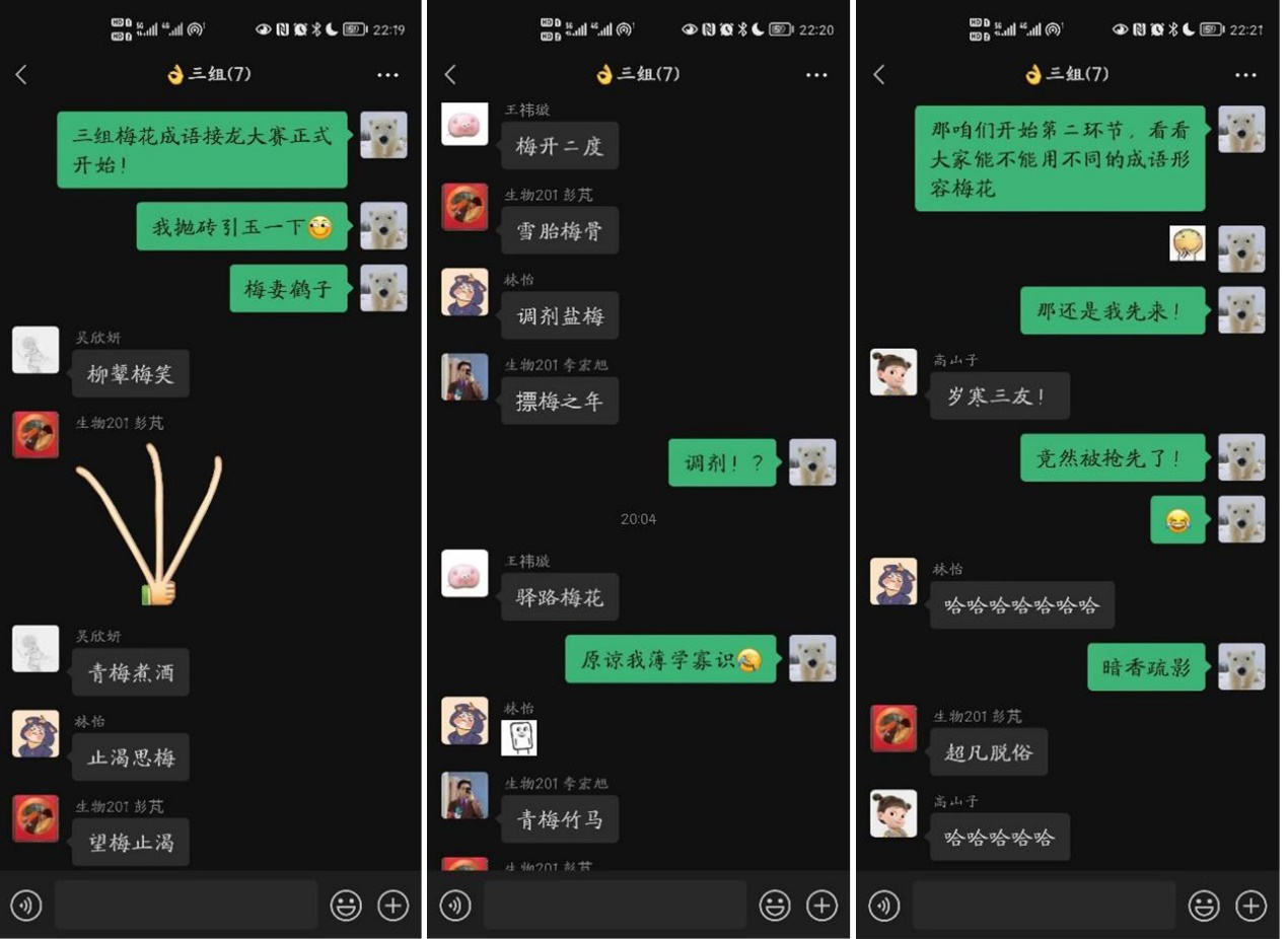 在梅花成语接龙活动中,大家踊跃参与,气氛活跃,青梅煮酒、望梅止渴、梅妻鹤子……,在大家争先恐后的抢答中一个个成语在群里跳跃。