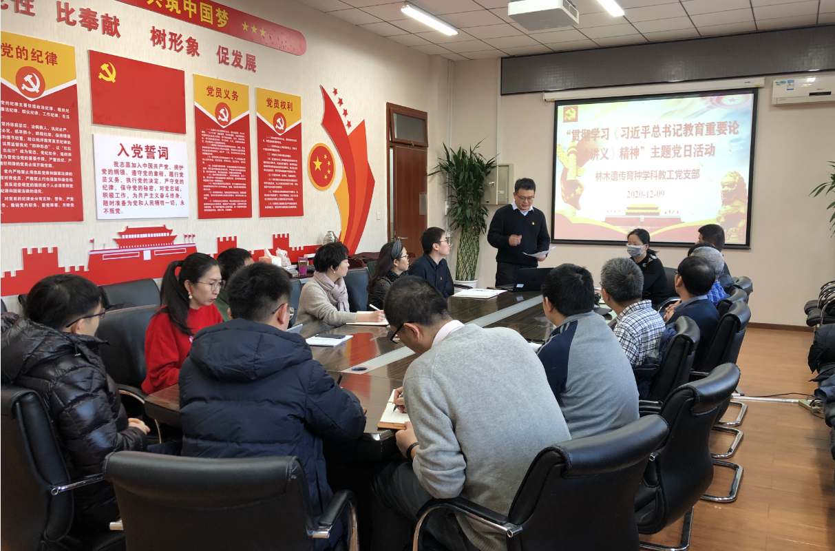 12月10日,林木遗传育种教工党支部开展贯彻学习《习近平总书记教育重要论述讲义》精神主题党日活动。支部教工党员20人参加了本次会议,会议由党支部书记杜庆章主持。