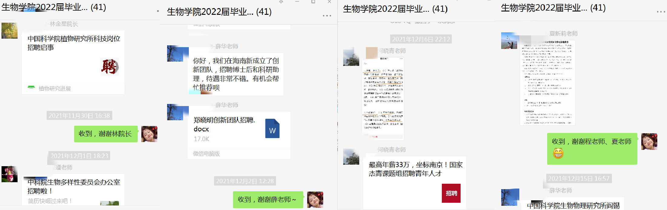 除开展“就业互助 研路同行”志愿服务项目,生物学院充分调动专业课教师、导师、校友和合作企业资源,建立“2022届毕业生就业工作群”,9月以来,学院教师累计推荐就业信息70余条,合作企业招聘信息30余项,形成良好的毕业生就业促进帮扶氛围。