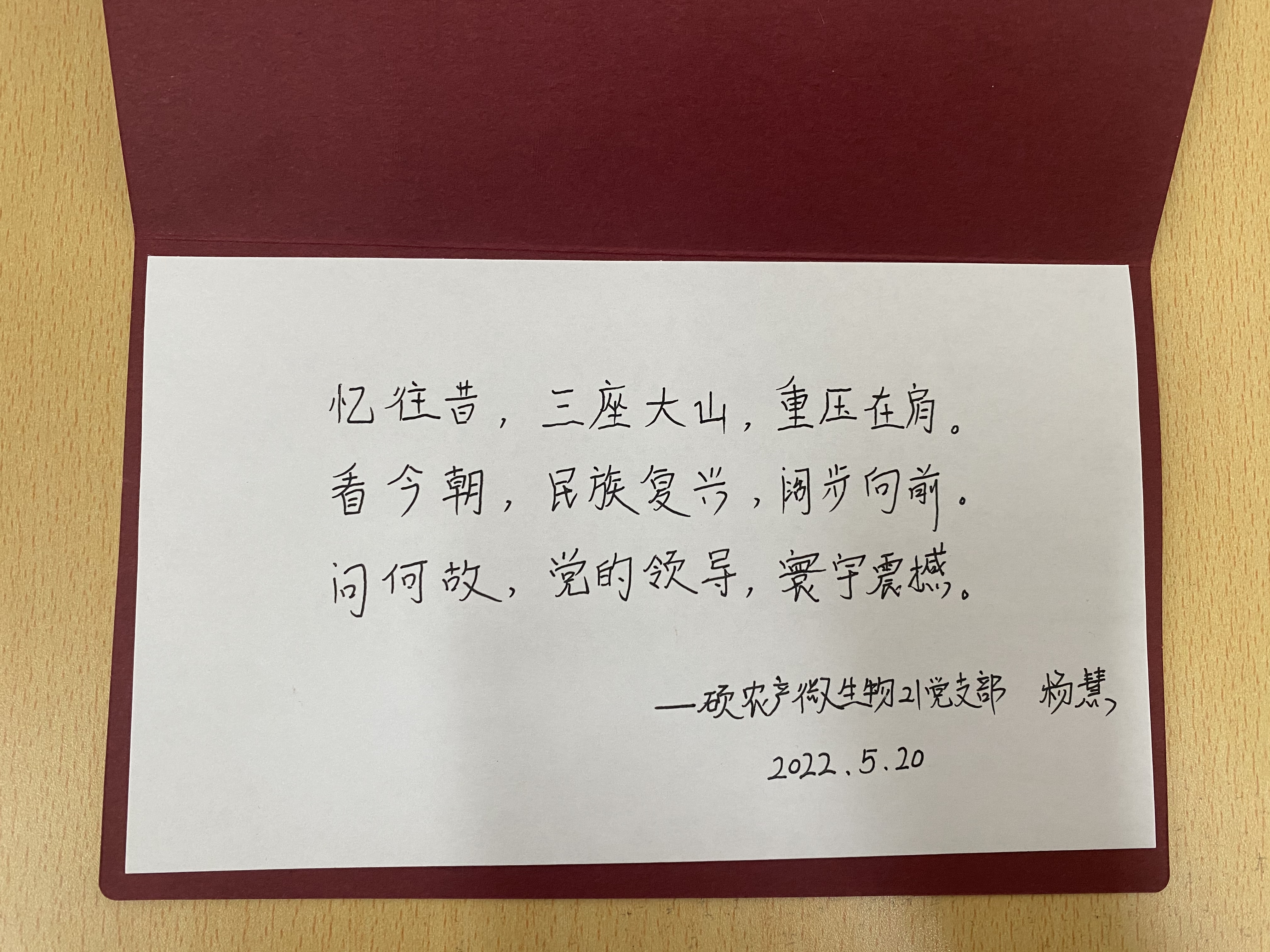 为庆祝中国共产主义青年团成立100周年,5月20日硕农产微生物21党支部联合班级和团支部召开“凝聚青春力量,彰显青年担当”主题党日活动。学习过后同学们可以通过纸笔真诚地写下对党的赞美和祝福。