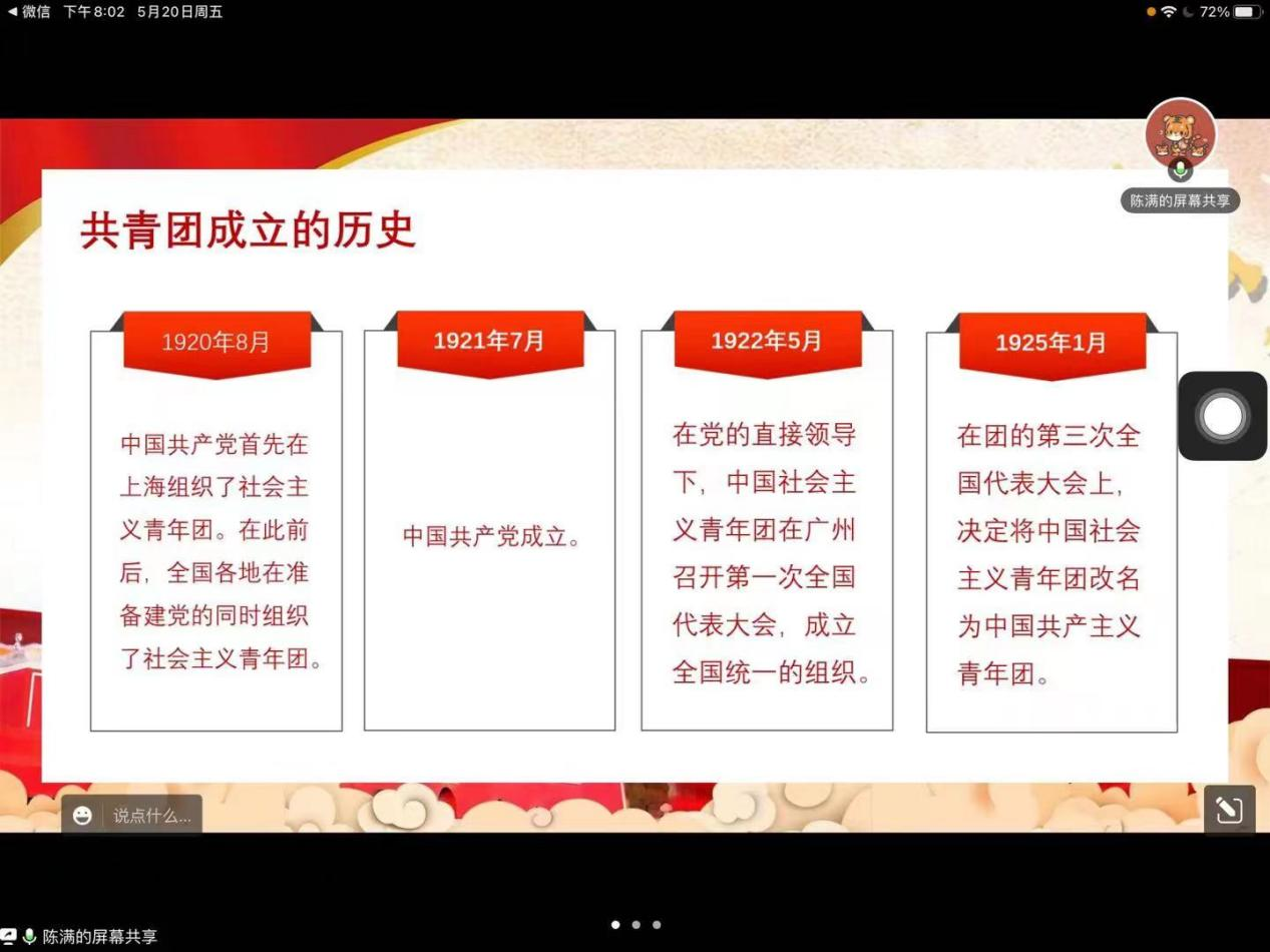 在本次活动首先由陈满介绍了中国共产主义青年团的发展历史。她号召广大青年要不断学习团的理论知识,努力完团组织交给的任务,在学习、劳动、工作及其他社会活动中起模范作用。