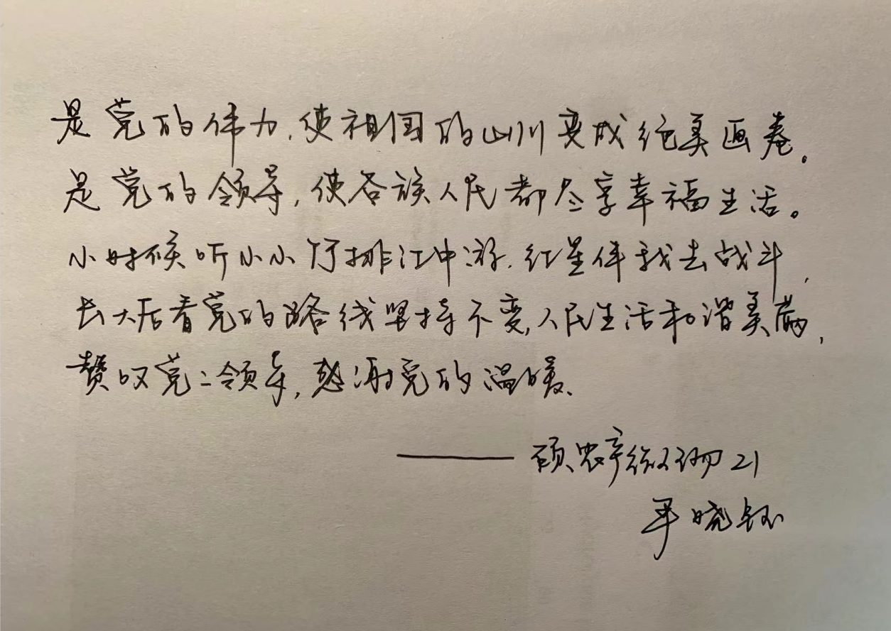 纸笔传递真情,硕农产微生物21班的多位同学真诚地写下了自己对祖国的祝福和赞美。对英雄的敬意需要新一代青年们的传承,永远铭记历史,永怀先烈。英雄王二小的坟墓所在的山坡上,已经长满了郁郁葱葱的树木,微风拂过,仿佛能听到那小英雄在歌唱着放牛的牧曲。在夕阳的余晖中,山坡上有一块红色的巨石闪耀着神圣的光辉。