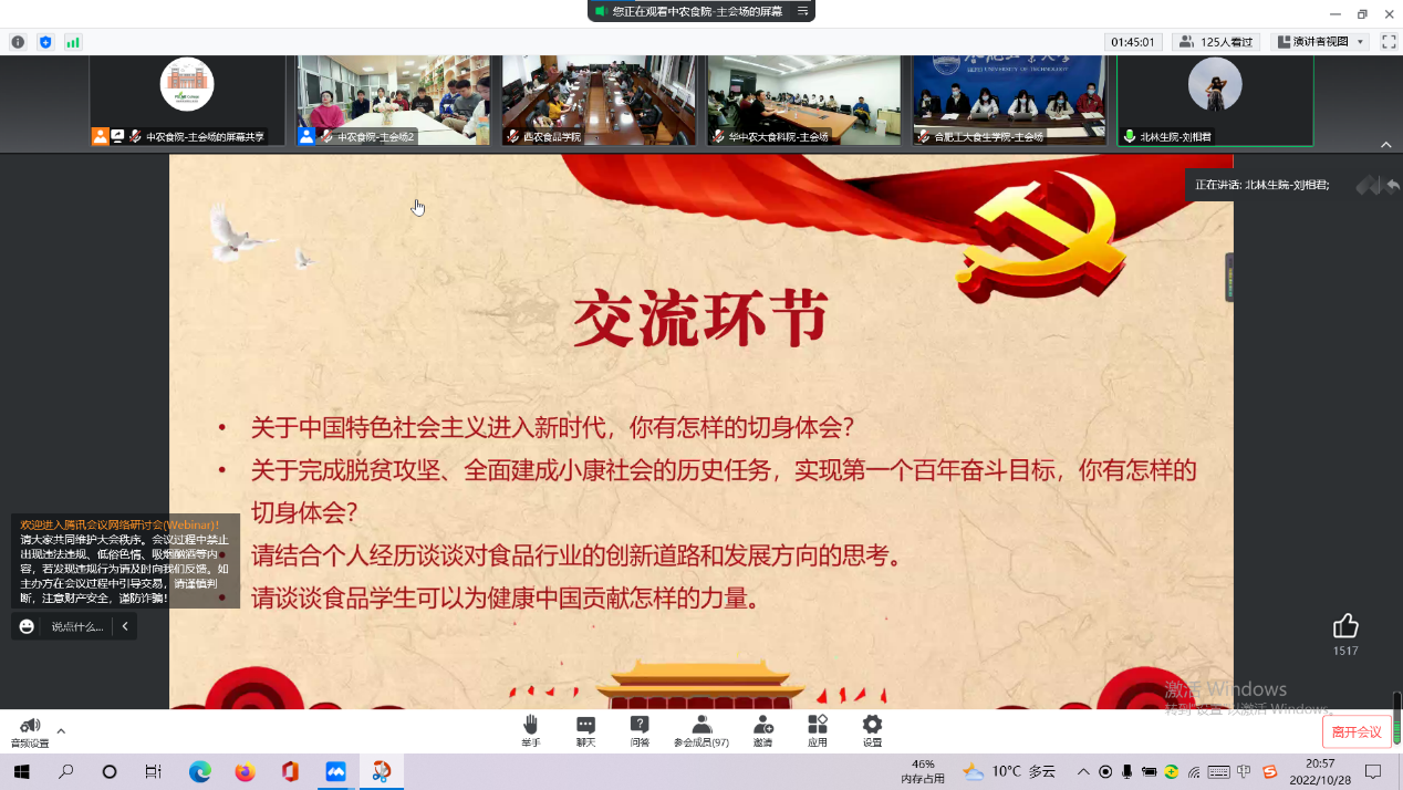 10月28日,北京林业大学学二党支部联合中国农业大学、华中农业大学、西北农林科技大学、合肥工业大学、四川农业大学五所高校的食品系党支部共同开展以“共学二十大,同绘食品梦”为主题的线上联学活动。