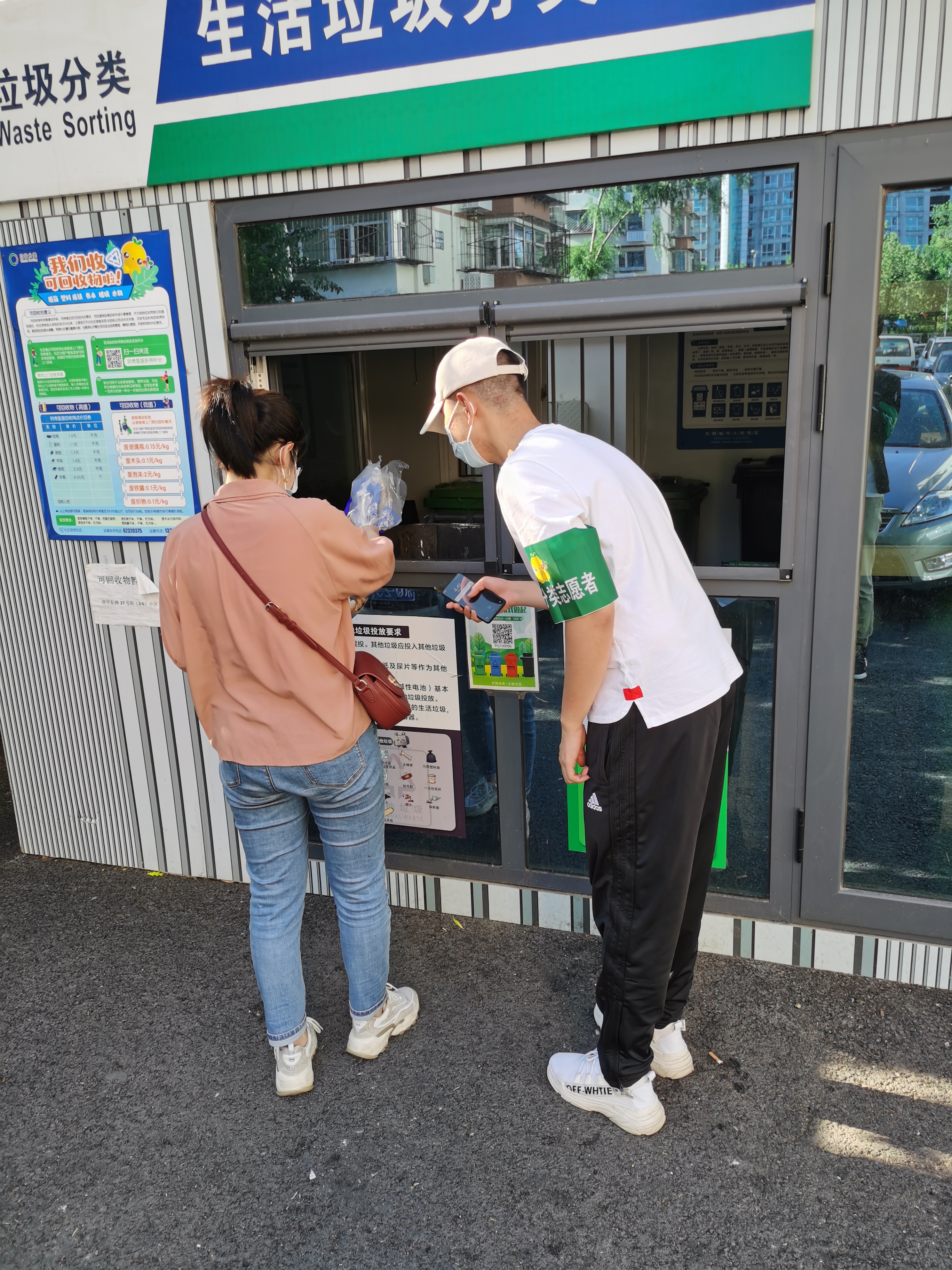 正值下午阳光强烈,支部同志们克服炎热天气,坚守各自岗位,与社区专门负责垃圾分类的工作人员交流,热情帮助前来投放垃圾的居民,获得大家一致好评。