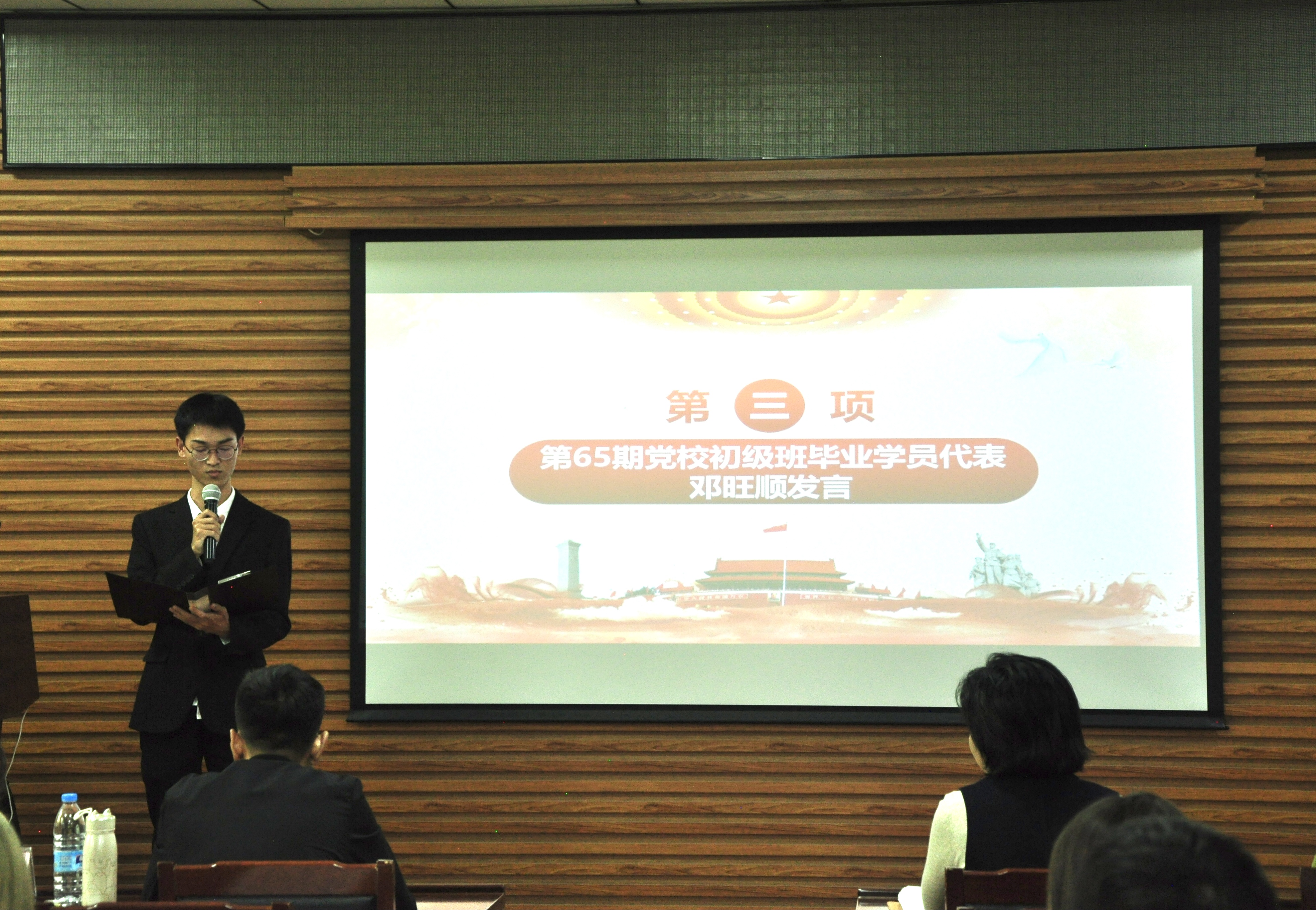 第65期党校初级班优秀结业学员代表邓旺顺分享了学习体会,并号召全体新学员学好党的理论知识,树立崇高理想信念,在学习中不断端正入党动机,在成为合格党员的路上不断进发。本期党校初级班学员钱奕明代表全体初级班学员发言,她承诺到,将在今后的学习中主动完善自我,充分发挥模范带头作用,努力成为符合党和人民期望的合格的社会主义建设者和接班人。